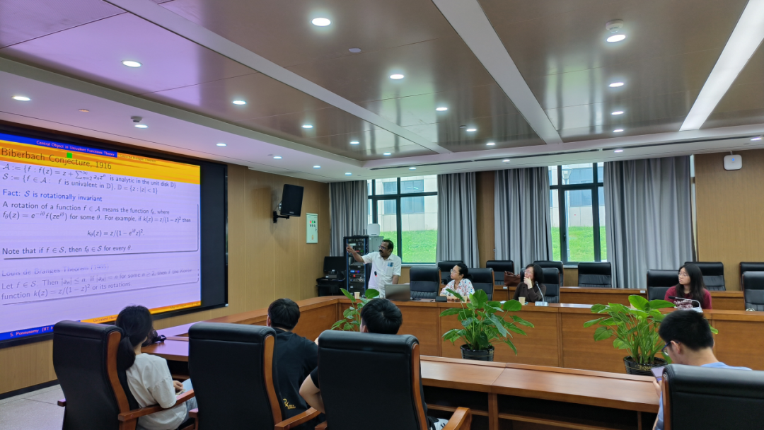 讲座中,Ponnusamy教授的报告主要是关于单位圆内单叶函数的凸性和系数。Ponnusamy教授以经典的Biberbach Conjecture(比伯巴赫猜想)为引子,援引多篇核心文献及专著,详细介绍了单位圆内的单叶函数问题的起源和发展过程。随后,Ponnusamy教授通过函数的表达式和图形的展示,重点介绍了带整系数和半整系数的单叶调和映射的个数。Ponnusamy教授不仅解释了这种函数的几何性质,还抛出了几个引人深思的问题,激发了在场学生的思维火花。与会学生们积极提出自己的见解,虚心求教,Ponnusamy教授一一解答,并给予亲切地鼓励。Ponnusamy教授的课程风趣幽默,将复杂的数学概念化繁为简,使在场的各位师生受益匪浅。讲座后,Ponnusamy教授真挚地寄语太阳成集团tyc的学子们,希望他们能够在数学领域上展露光芒。