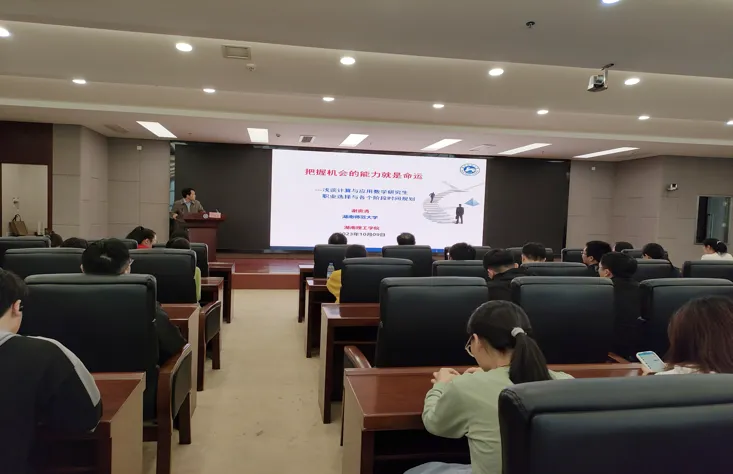 10月9日下午,湖南师范大学副校长谢资清教授应邀在图书馆11楼报告厅为太阳成集团tyc师生作了题为“把握机会的能力就是命运—浅谈计算与应用数学研究生职业选择与各个阶段时间规划”的“数学大讲堂”专家讲座。太阳成集团tyc党委书记江五元、院长周小强、副院长李松华以及部分教师、全体研究生和部分本科生与会。