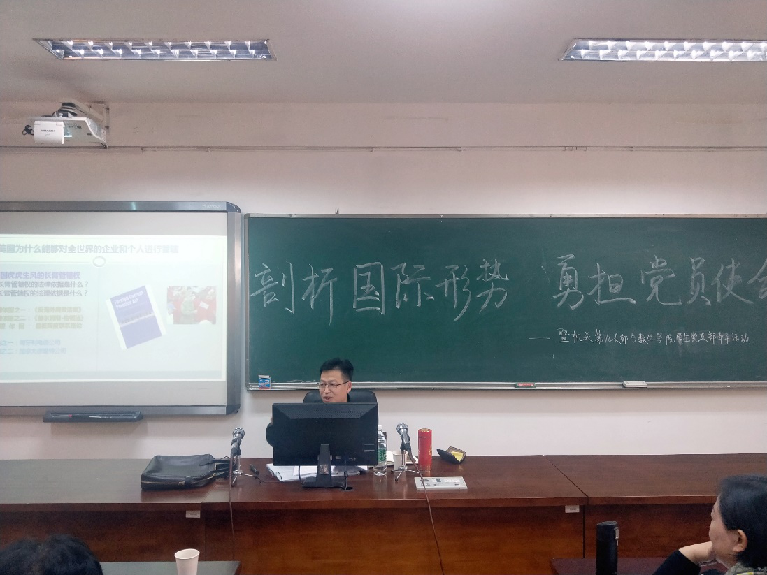 此次党课以“从孟晚舟事件看美国的隐秘战争”为题,从“孟晚舟事件始终及其疑惑”“美国为什么能够对全世界的企业和个人进行管辖”“世界各国对美国霸权主义的反叛”和“对大学生启示”四个方面展开讲述。周旭进同志结合历史案例,揭露了美国通过非法手段,打击商业竞争对手这一巨大的经济陷阱,深刻阐述了美国隐秘的经济战争对中国以及世界的重大影响。