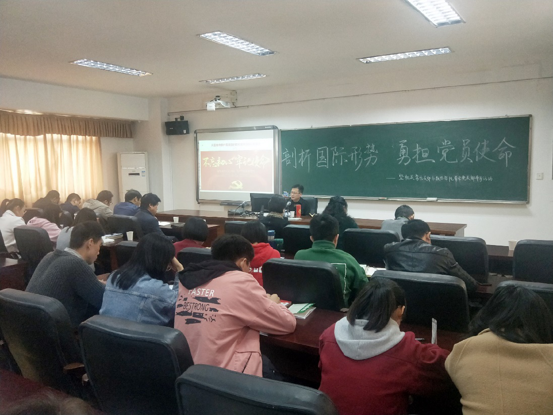 本站讯 11月22日下午14:00于5511,机关第九党支部牵手太阳成集团tyc学生党支部,顺利开展“剖析国际形势、勇担党员使命”主题党日活动。机关第九支部全体党员、太阳成集团tyc党总支副书记易政群同志出席,太阳成集团tyc学生党支部全体党员参加。此次主题当日活动以讲党课的形式开展,易政群同志主持,周旭进同志主讲。
