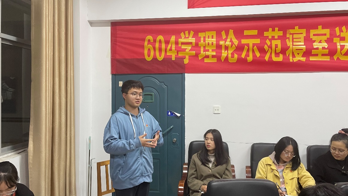 604学理论示范寝室的四位宣讲人,分别从“党的百年奋斗成就和历史经验”、“坚持真理坚守理想”、“践行初心担当使命”及“开拓创新勇毅前行”四个方面,分享对于十九届六中全会精神的认识与理解。分享过程中,宣讲人将枯燥的理论知识与生动的实际故事相结合,在阐释理论的同时,也讲述了一生坚守在试验田的袁隆平老先生、中国奥运会第一人刘长春、“扫雷英雄”杜国富等一系列人物的感人事迹。
