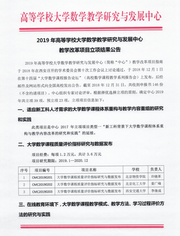 3月20日教育部高等学校大学数学教育与研究发展中心发表立项结果公告,我院张再云教授申报的“构建研究性教学模式,培养大学生数学创新能力”项目获得立项支持。
