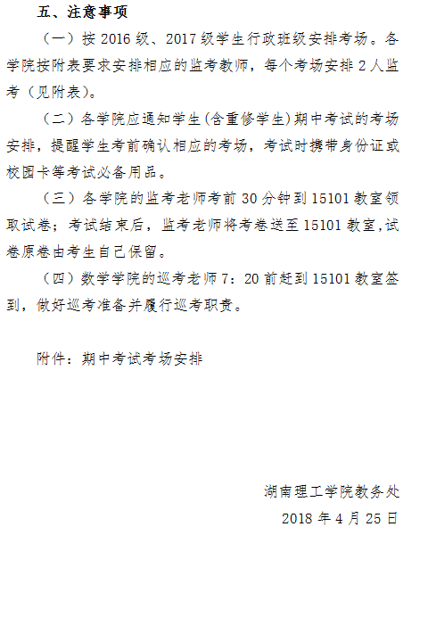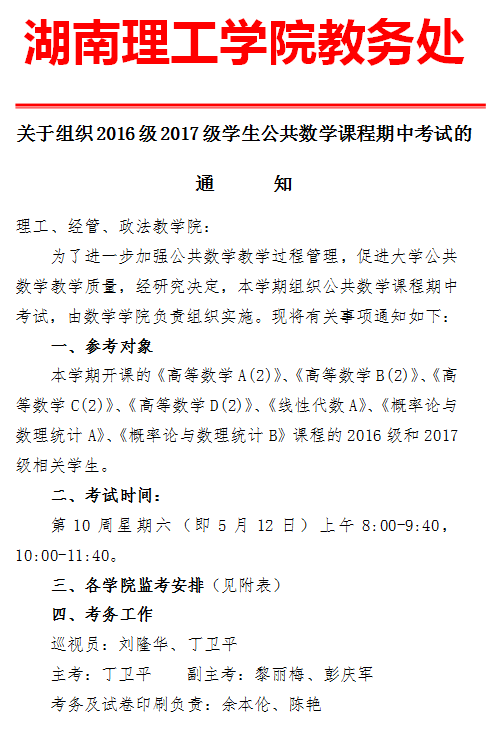 5月12日上午,根据教务处关于组织2016级2017级学生公共数学课程期中考试的通知,在各相关院部的协同配合下,举行了2018年上学期公共数学课程的期中考试,在我院与考试中心的精心组织和相关学院共同努力下,顺利完成了组考工作。考试期间,教务处主管教学运行的刘隆华副处长在教代会空隙期间对考场进行了巡查,有关学院负责人也检查了各自学院学生考试情况。