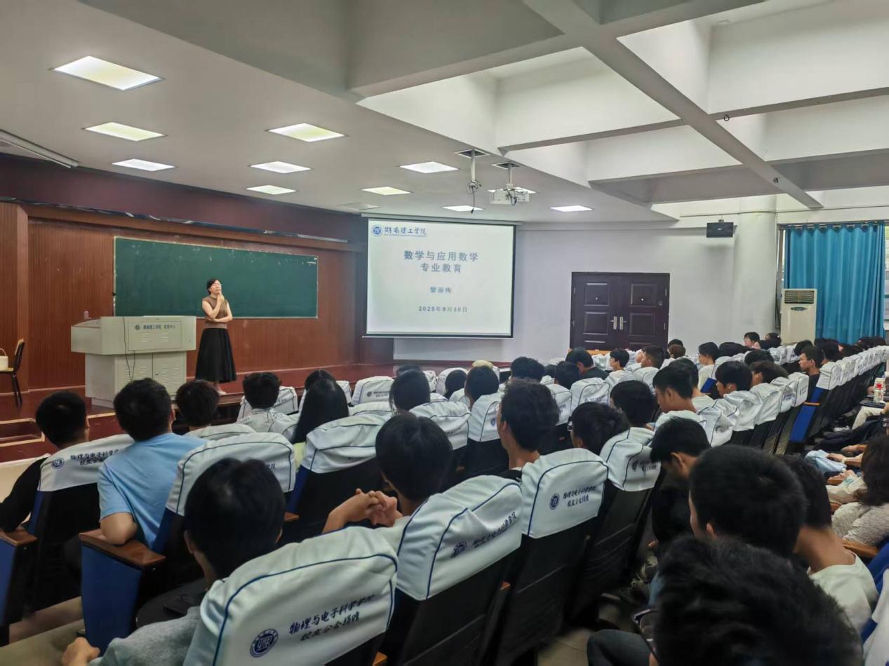 在6号报告厅举行的数学与应用数学专业讲座中,黎丽梅副院长以“数学不仅是科学的基础,更是培养逻辑思维和解决问题能力的重要工具”为引,围绕专业分类、培养方案、应用前景与就业方向三大方面展开系统讲解。她特别强调,师范专业新生应尽早确立从教目标,充分利用大学资源,努力成长为具备扎实专业素养的优秀数学教育人才。