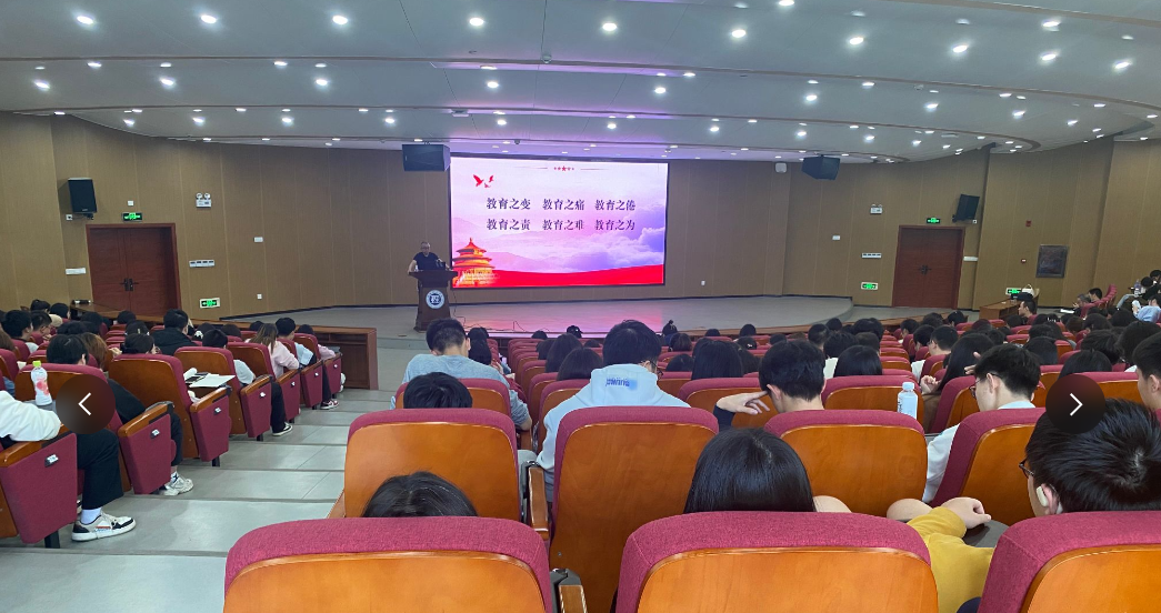 讲座结束后,江书记进行总结发言,实习生代表郑重佩戴校徽并宣誓:"以青春践行教育报国誓言,做民族复兴路上的筑基人!"铿锵誓言彰显新时代师范生的使命觉醒。