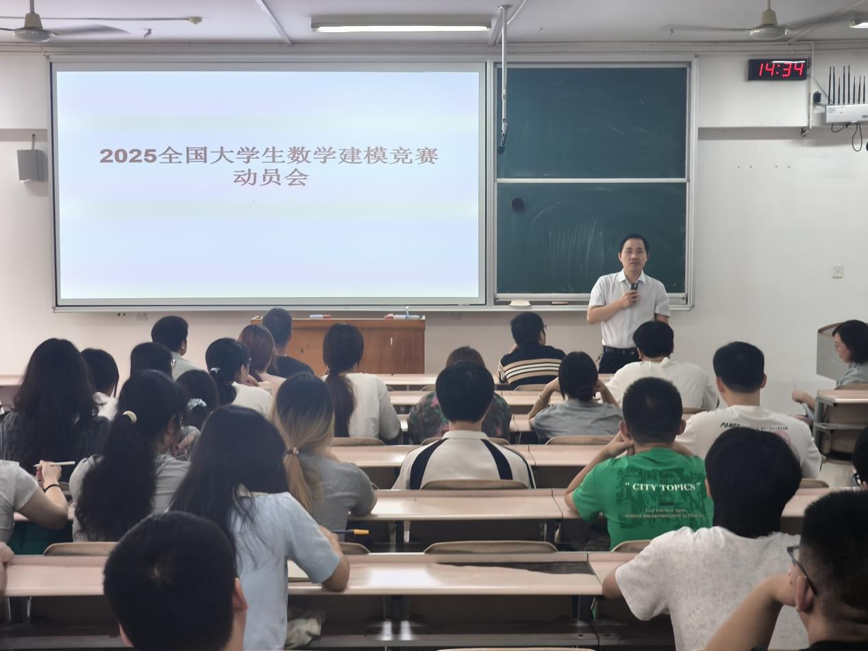 随后,周小强院长围绕竞赛备赛方向作动员讲话。他重点强调,2025年竞赛在选题方向与评分标准上存在新调整,要求参赛学生密切关注、精准把握变化要点。周小强院长鼓励全体参赛学生“敢于突破创新、积极迎接挑战”,并针对备赛与参赛环节提出三点具体建议:“一是科学搭建论文框架,确保内容结构清晰、逻辑连贯;二是精准把控建模关键环节,避免核心步骤缺失;三是严格遵守学术规范,杜绝查重问题,坚守学术诚信底线。”最后,周小强院长预祝参赛学生在竞赛中取得优异成绩。