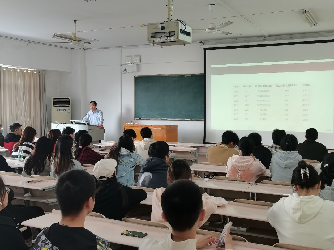 会议中,齐亮菲向考研学子讲解了复试流程和注意事项,并强调要提前做好充足准备,了解报考学校导师的相关情况和研究领域。随后她结合全国的考研形势和学校历年考研情况,逐一为考生们介绍我院往年考研情况、专业课复试的相关事宜、考研调剂的详细步骤以及相关院校新开设的考研专业,并对这些新开设专业的考研难度以及成功上岸的可能性进行分析。