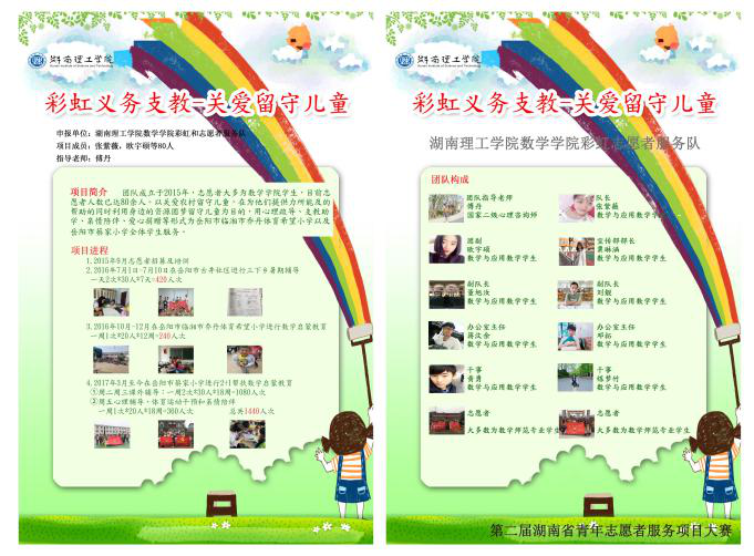 湖南理工学院太阳成集团tyc彩虹志愿者服务队成立于2015年,由国家二级心理咨询师傅丹老师进行指导,现任青年志愿服务中心主席粟琳涵为队长,带领干事和志愿者开展一系列以关爱留守儿童为主的志愿服务活动。